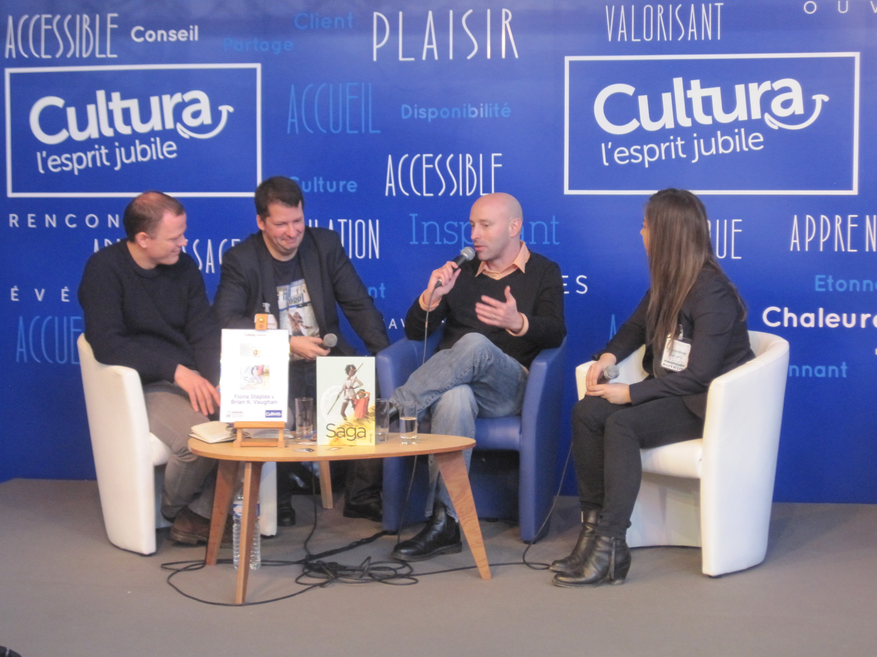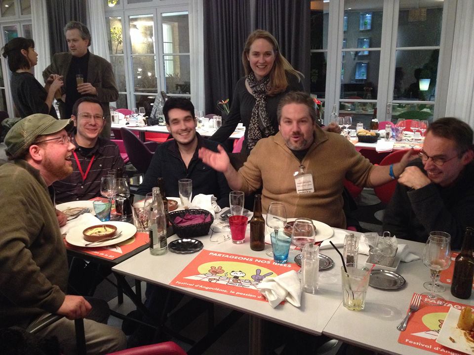 After I had safely relocated back to my pre-festival lodging, I was relieved to approach the day with a relaxed attitude. I spent the first bit taking another lap through the Watterson exhibit, as well as visiting the pristine representation of the work of Fabien Nury. After a quick bilingual Brian K. Vaughan/Fiona Staples panel, I met with Dargaud social media representative Delphine Bonardi about some marketing ideas I have for Trish Trash. And then it was off to lunch at Chez Madden/Abel, where I noshed with American cartoonists Josh Neufeld and Nick Bertozzi, Jenny and Caitlin, British academic Paul Gravett, and senior Dargaud editor Thomas Ragon.