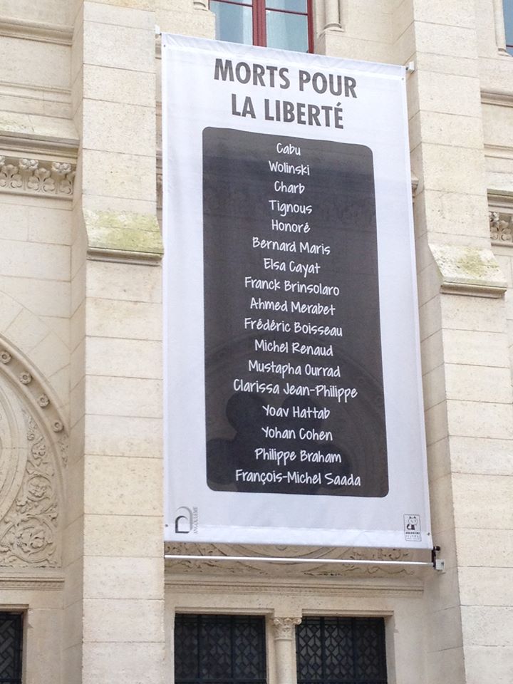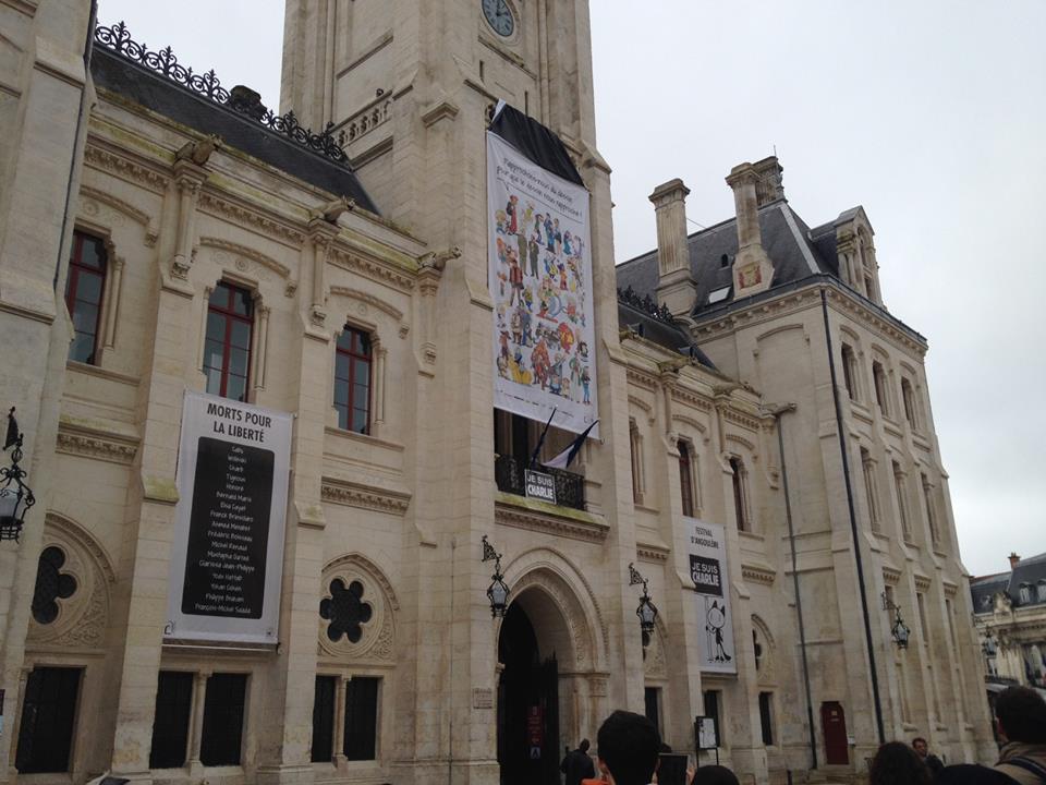 “Went to the “launch” ceremony hosted by the mayor of Angoulême and the Festival director which promised the unveiling of a powerful and poignant statement about comics and free speech. Was dismayed by the result: a platitude framing a kitschy panorama of inoffensive BD characters that could just as easily decorate a flea market’s used comics stand. I wouldn’t bother to comment except that this was all done with great solemnity and pomp. And all the while, a much more powerful and simple statement hangs right beside the new one, only now its overshadowed.”
