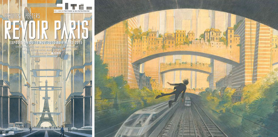 Few are better at creating alternate universes than that of Franco-Belgian comics visionaries François Schuiten and Benoît Peeters. With a keen focus on the culture, politics, and architecture of these places, they have been exploring the themes of changing urbanism amidst neo-futuristic fantasy landscapes, set on their own version of earth, for the last 35 years. Each volume of the series takes place in a different city, with its own distinct infrastructure; with their latest installment of the Les Cités Obscures series, Revoir Paris (Casterman, 2014), the duo gives the French capital their own elegant, science-fiction makeover. In conjunction with this release, the Cité de l’Architecture et du Patriomoine has invited them to curate a show to host their vision, a vision well-supplemented with the work of Paris’ legacy of innovators. Part art exhibit, part speculative installation, there is as much attention given to the city’s history of urban planning and design as there is to fantasy and utopian daydream. This past weekend, I had the pleasure to indulge my fancy and take it all in.